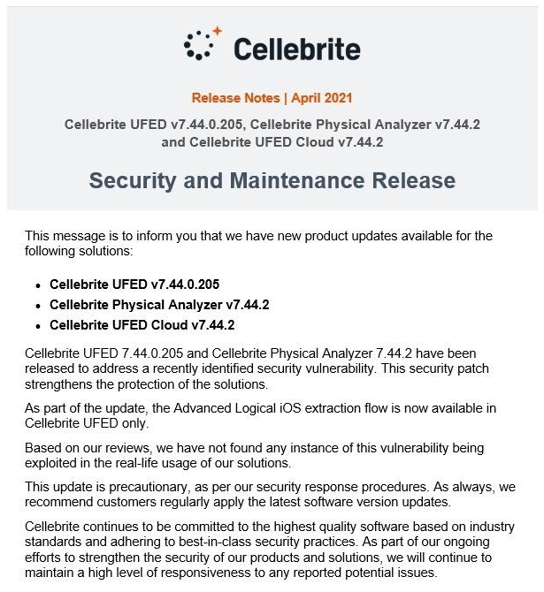As a result of Signal’s research, Cellebrite appear to have been forced to release an update this week (W/C April 26th).