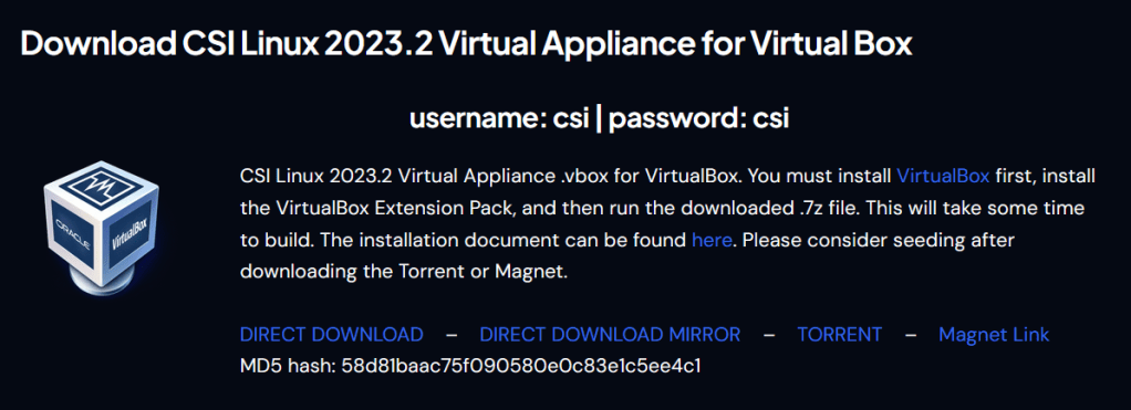 As noted above, in section 2.4.2, the default password for CSI Linux is “csi”. This can also be directly verified from the CSI Linux downloads page, available at https://csilinux.com/csi-linux-downloads/. A screenshot of the relevant section is below: