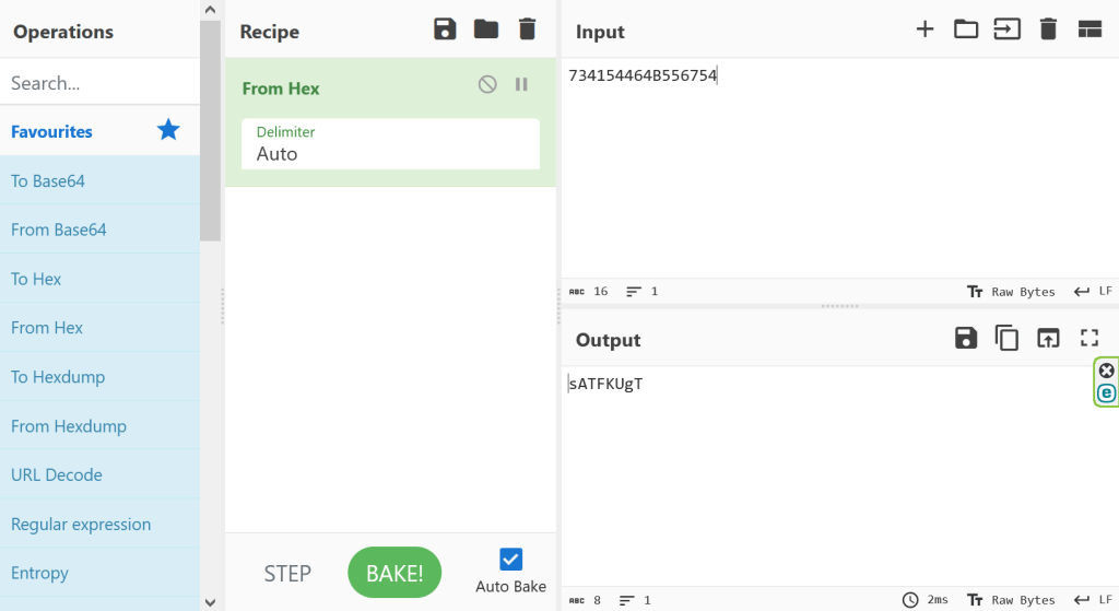 CyberChef can convert the hexadecimal value to the ASCII characters that they represent. I used the recipe From Hex, and put the value 734154464B556754734154464B556754 as input. As shown in the below screenshot, the output is sATFKUgT. This looks much more similar to the example site that was created (which used “gUnxCfpY”).