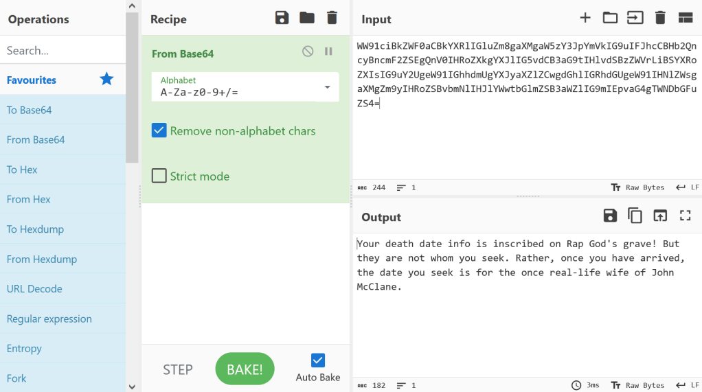 Using CyberChef, and the From Base64 recipe, I was able to decode the hidden message from Pastebin, as shown below: