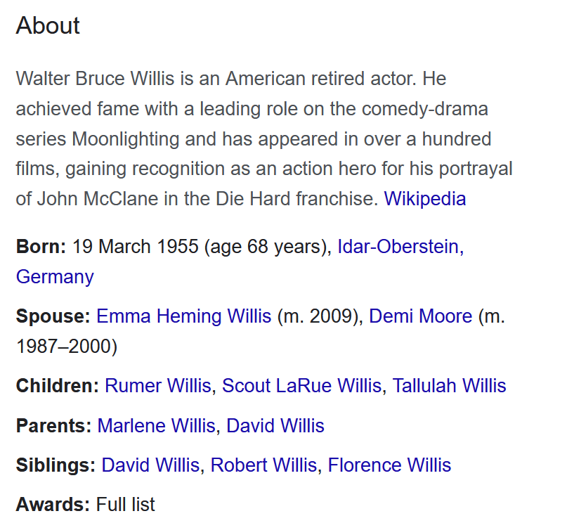 As noted above, the decoded message talks about the “real-life” wife, indicating that the required response relates to a wife of the actor who plays John McClane – Bruce Willis. Clicking on the link here to Bruce Willis brings up the below “About” section: