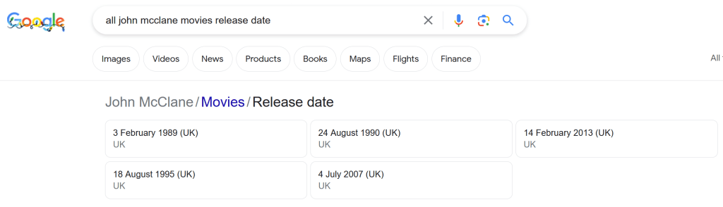 I ran a Google search for all john mcclane movies release date, which resulted in a breakdown of the release dates of the various films, as shown below: