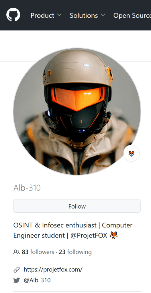 Visiting the GitHub page, you can see in the profile that this links to a website at https://projetfox.com, as shown below: