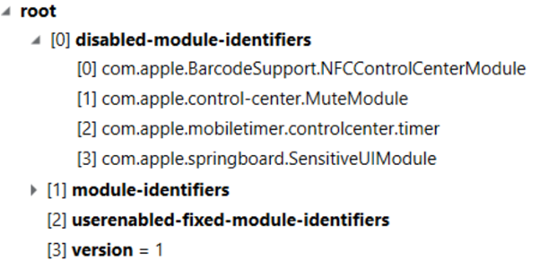 I then thought that it could well be related to the Control Centre… that would fit. I couldn’t find a specific application, so went into Axiom to have a look in the filesystem, and it was easy to find a location with some interesting data – /var/private/mobile/Library/ControlCentre. Within the folder was a plist file – ModuleConfiguration.