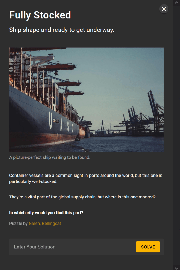 This month Bellingcat are running a series of OSINT challenges, each week a new set of five challenges is posted for that week. Last week, the “Bellingcat Globetrotter” series focused on geolocation challenges, this week the “Maritime Mysteries” series is focused on sea, ships, and similar. Knowing that Rae Baker specialises in maritime intelligence, I pulled my copy of Deep Dive (which I would highly recommend) from the shelf, ready for action. It has a great chapter titled Transportation Intelligence, some of which is specifically focused on maritime vessels (for example providing background on port calls, covered in the Cyrillic Confusion challenge).