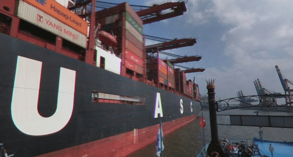 We can now see another UASC ship (United Arab Shipping Company), the same owner as the ship shown in the photo to be located. We can also see the bridge in the distance as well as the sets of cranes.