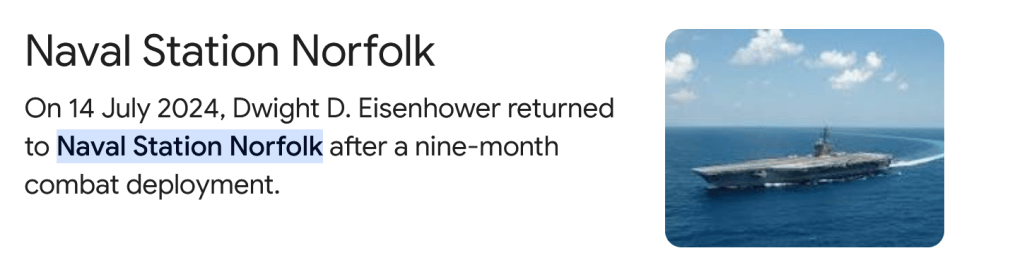 Note – before focussing on the Norfolk base, I did start to look into various details of deployments that the USS Dwight Eisenhower had been on, to see if I could identify missions that it had been on with multiple aircraft carriers, and use that as a basis to identify the other ship in the photograph. For example using news stories from US Fleet Forces Command in which the Eisenhower is tagged – https://www.usff.navy.mil/Press-Room/News-Stories/Tag/175410/uss-dwight-d-eisenhower-cvn-69.