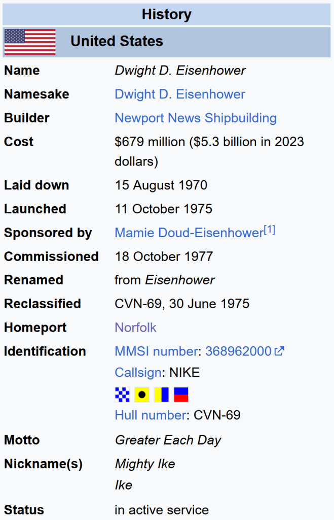 Also, from the Wikipedia page for the USS Dwight D Eisenhower, we have the below, stating the Homeport is Norfolk.