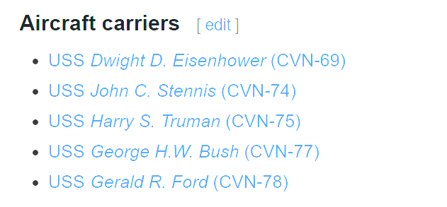 It is helpful to note that there are only 11 aircraft carriers currently in use by the US Navy. A list of them can be found on Wikipedia – https://en.wikipedia.org/wiki/List_of_aircraft_carriers_of_the_United_States_Navy#List.