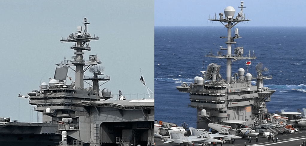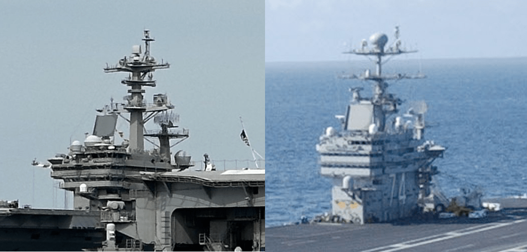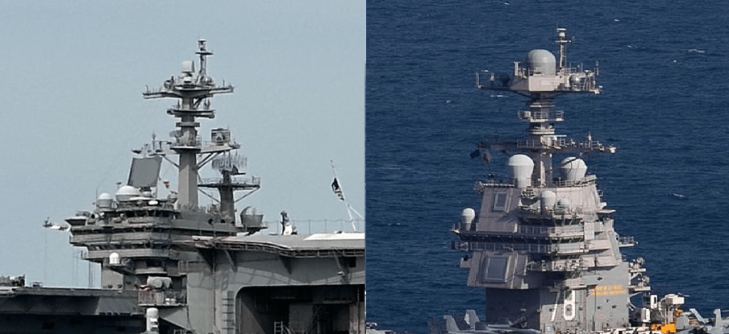 Again, this is a very different structure, note the solid fronts with what look like “windows” installed on the USS Gerald Ford, but not on our example ship.
