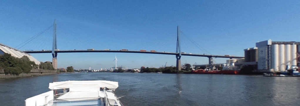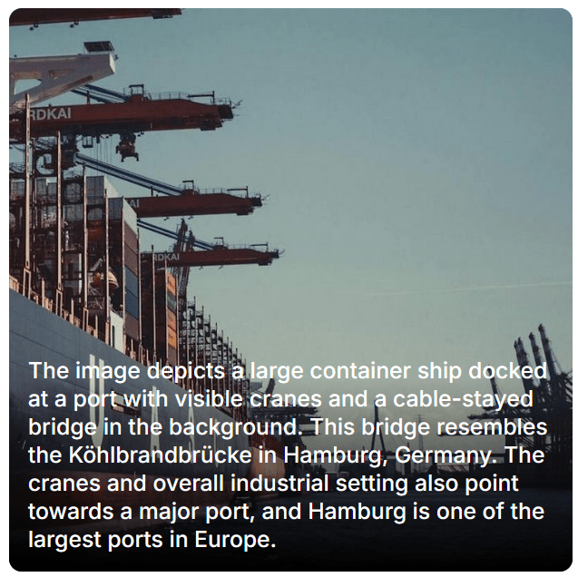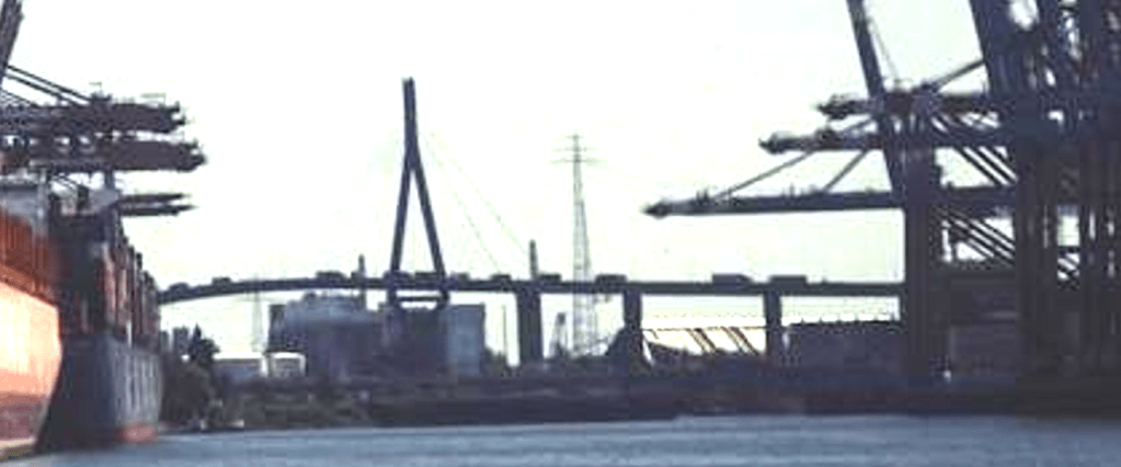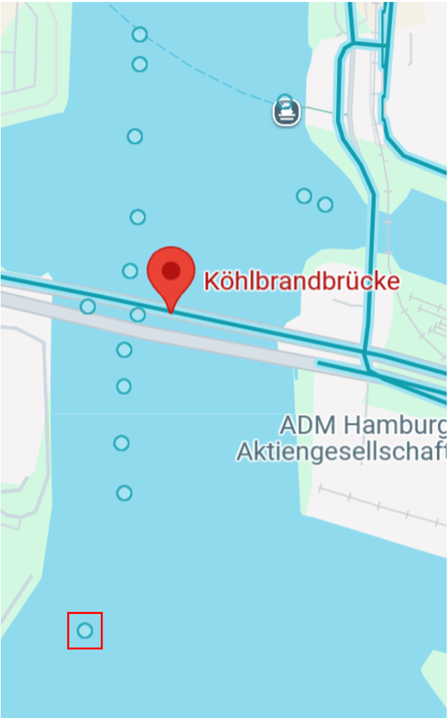 The mentioned Köhlbrandbrücke bridge, runs across the water nearest the pinned image in the above map from Geospy.ai.