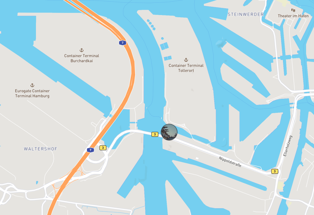 Looking for other locations, I was able to identify locations for the locating of container ships, including the cranes… obviously these were good places to check. There are a number of container terminals around, but looking for these near to the bridge, I found the HHLA Container Terminal and the EUROGATE Container Terminal, shown in the map below: