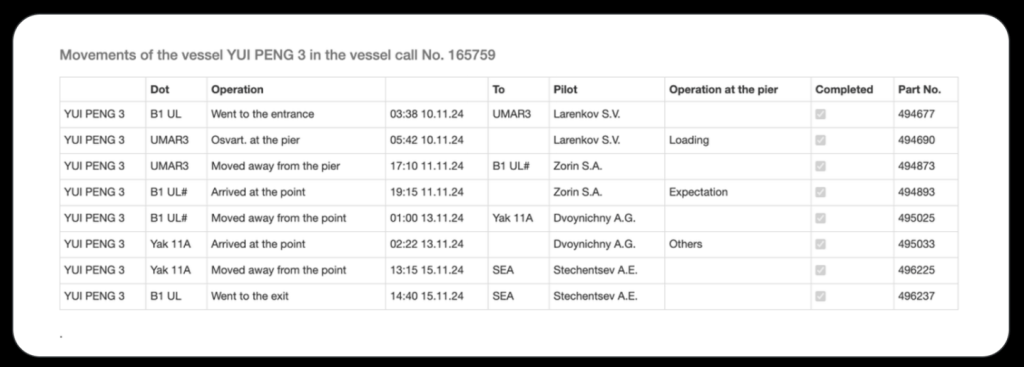 At the top of this table we see “Ust-Luga: Movement log (11/14/2023-11/16/2024) (Sorted by operation date (latest on top)”