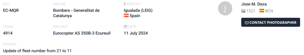 Running another search on the planespotters site for serial 4914, we get 5 results. The most recent of which is 11 July 2024 – https://www.planespotters.net/photo/1628786/ec-mqr-bombers-generalitat-de-catalunya-eurocopter-as-350b-3-ecureuil