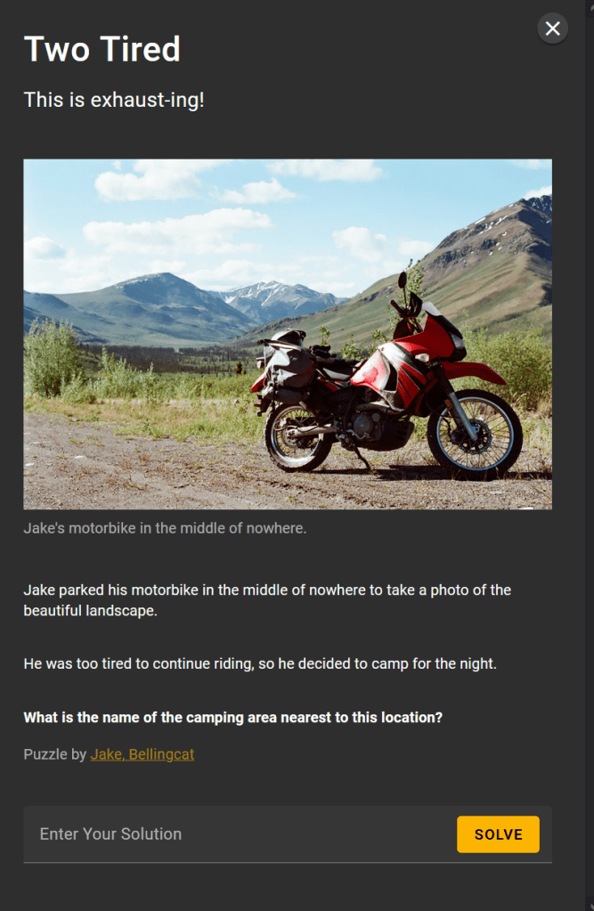 I did then do some digging which didn’t take me much further, looking into the creator of this challenge (Jake Godin), finding an article on his about long distance motorbike trips (https://districtfray.com/articles/jake-godin-motorcycle) which mentions a few specific locations that he has travelled to. I also found a GitHub page with a photo of Jake with some mountains in the background. I thought that this may be from a similar location, but (using Geospy.ai) they appear to be in California, so likely a separate trip. I also used an online tool to remove the motorbike from the image to be located, to try and minimise the focus of analysis tools on the motorbike to see if this gave better results, but I didn’t get much more from Google Images or Geospy.ai.