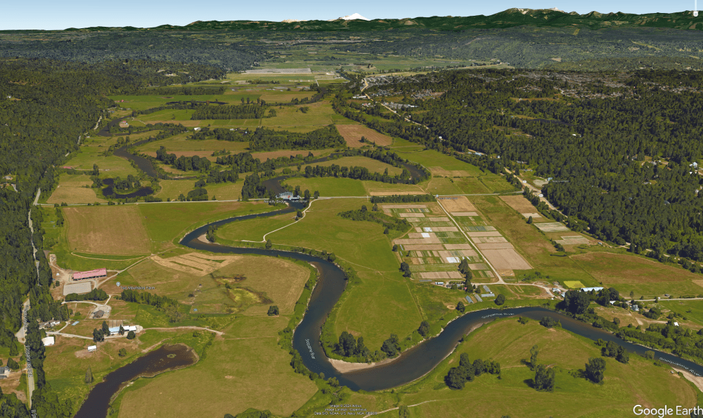 This area seems like a good place to start. I fired up Google Earth, but needed something specific to look for. Looking at the photo we are looking to locate, there are a few points of note. We are looking for an area between two heavily wooded areas. We also have a small bridge, but there are also what look like two squares of trees which are quite well defined.