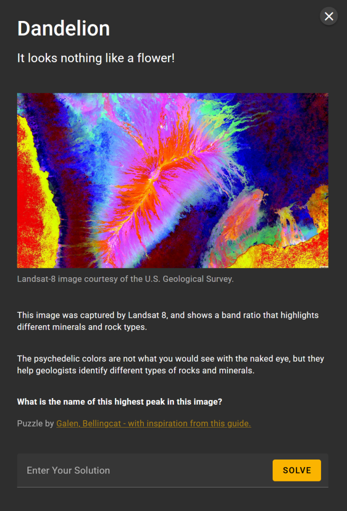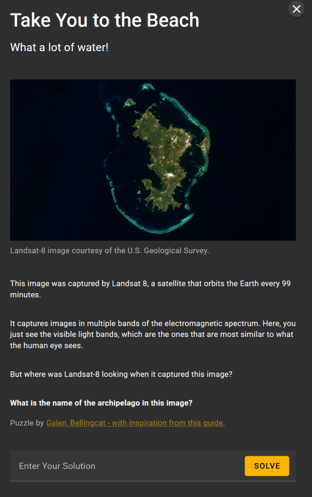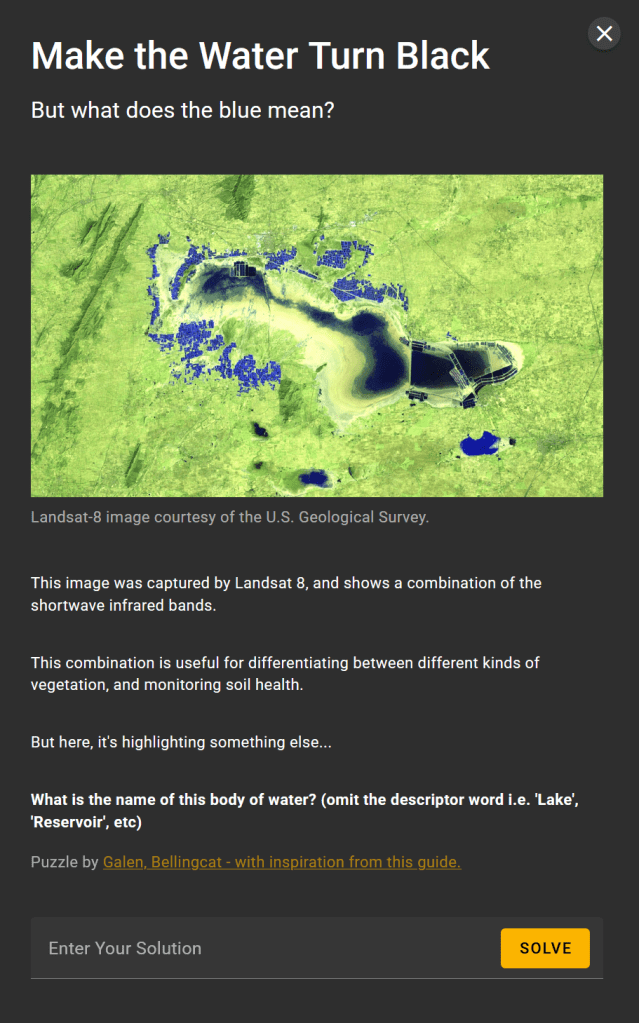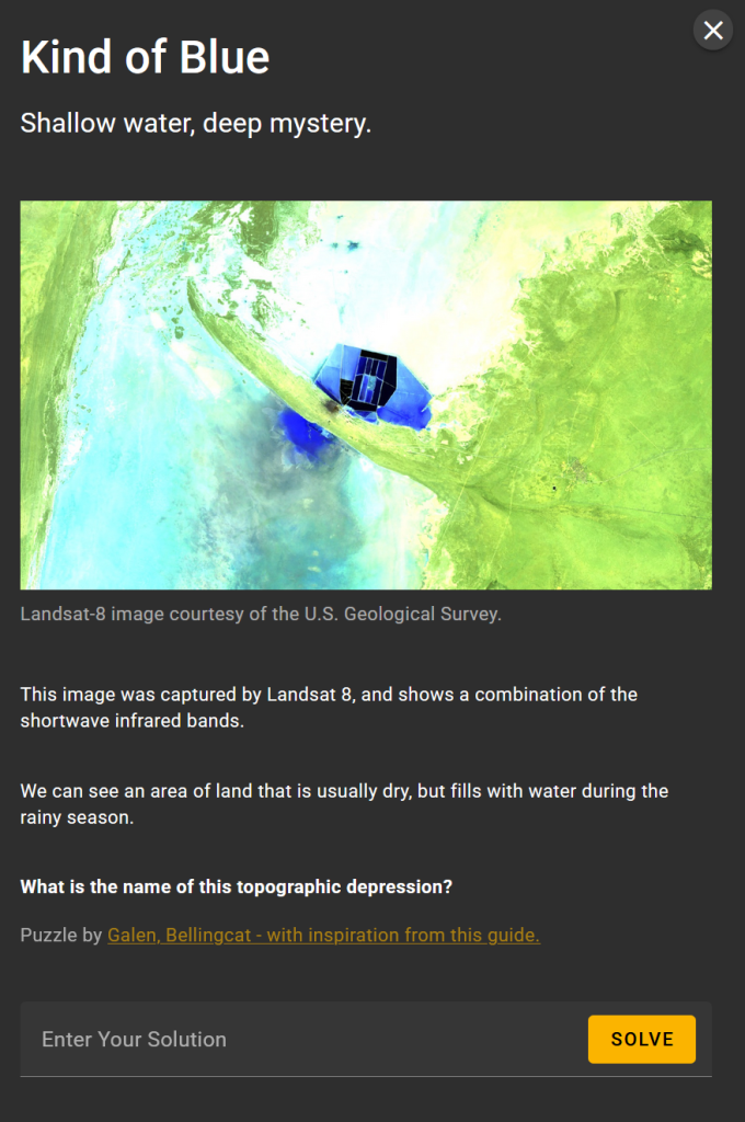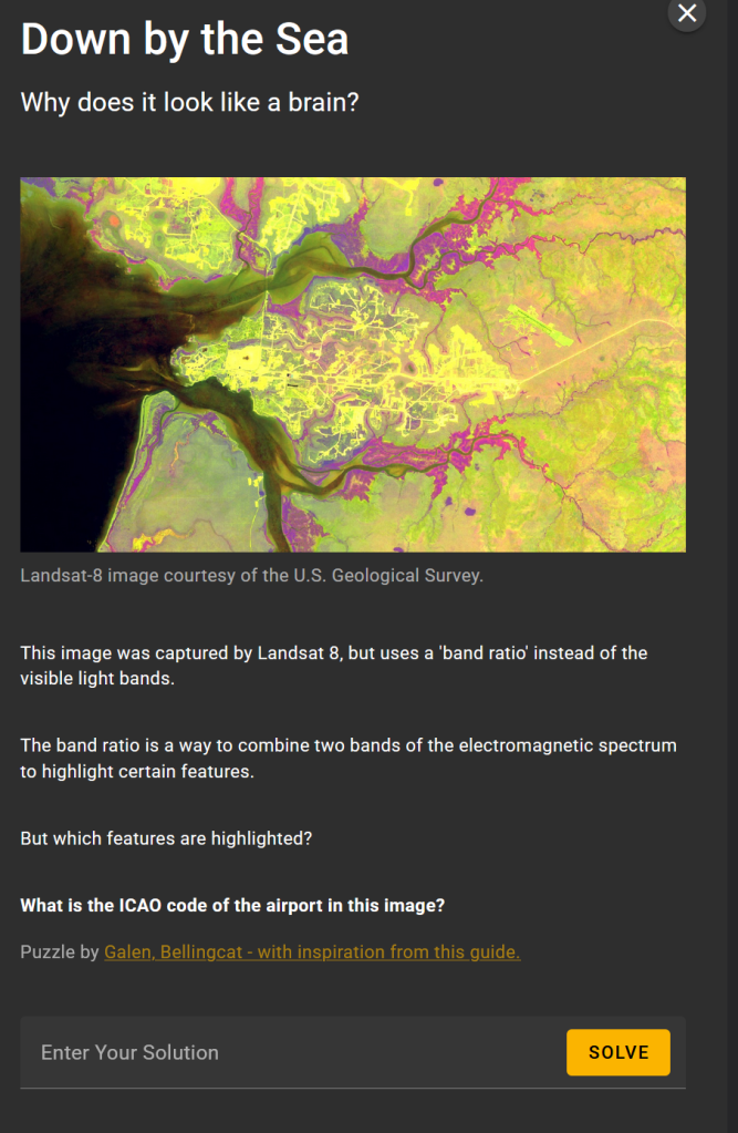 The plan is that each month, on the first Monday of the month the first challenge will be released, followed by an additional challenge each day, so that after that week, there are five challenges available. As with previous sets of challenges, there will be a theme each month. For March, this was Multispectral Analysis, linking to a great article from Agnes Cameron. This article also links to a tool developed by the Bellingcat team to display multispectral imagery, using Google’s Earth Engine. This is well worth playing with, and also comes in handy during the challenges.