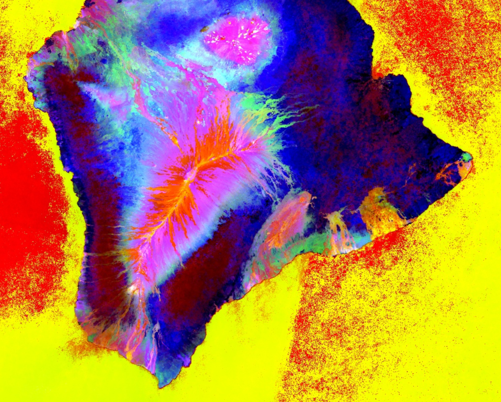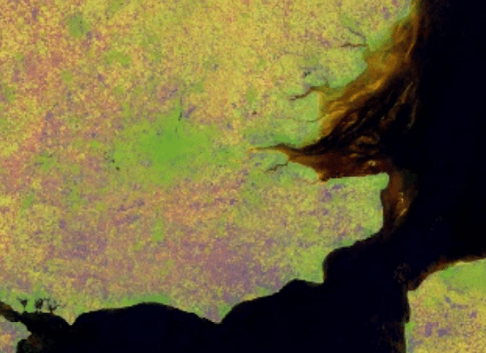 “This image was captured by Landsat 8, but uses a ‘band ratio’ instead of the visible light bands. The band ratio is a way to combine two bands of the electromagnetic spectrum to highlight certain features. But which features are highlighted?”