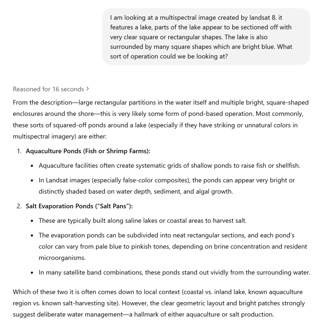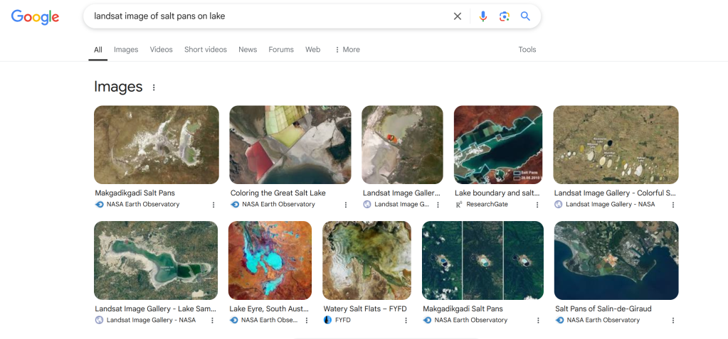 I then ran a simple Google search to see if I could find other Landsat 8 images of salt pans on a lake for comparison to check that I was on the right path, or if I got lucky something that matches the image: