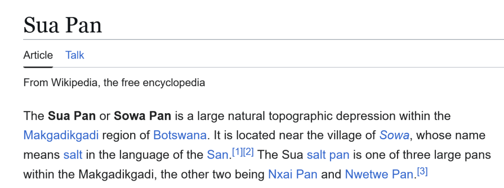 I searched for the largest salt panning operation based on a lake, and this was reported as Botswana’s Makgadikgadi. Looking at this on maps, it did not look like the right location, but I did identify an area showing the sale panning operation: