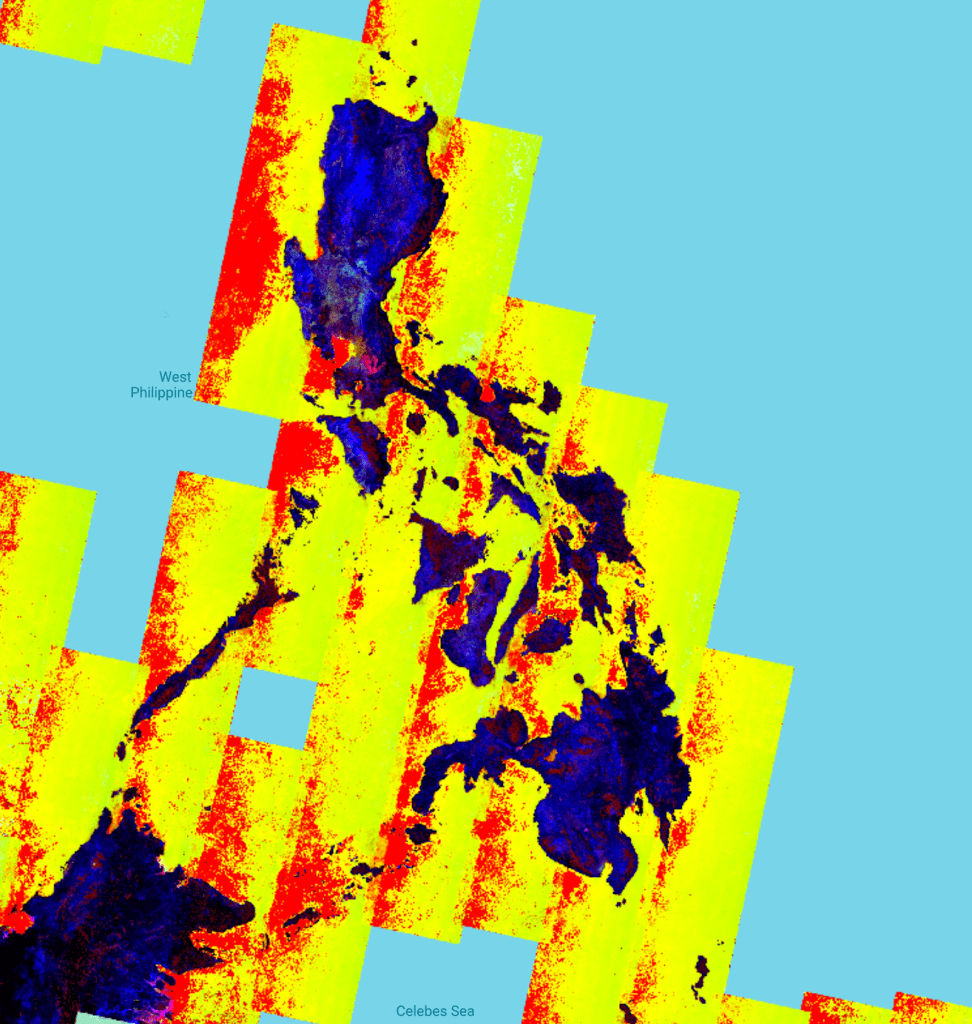 It looks like I was indeed correct, and that the yellow and red could represent how the sea is shown in this type of multispectral image.