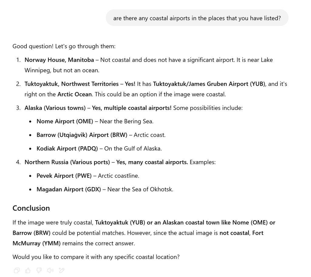 “However, since the actual image is not coastal, Fort McMurray (YMM) remains the correct answer”.