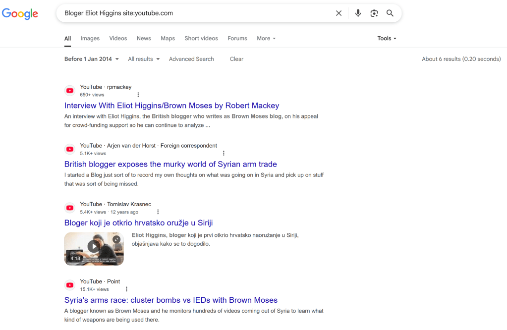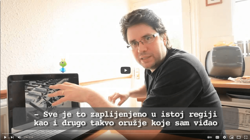 There is an interview with Eliot Higgins in the top hit.. though this does not appear to be the one that we are looking for, since it seems to be based in English, and the video, based on the translation of text in the challenge image, seems likely to be in Bosnian/Croatian/Serbian.