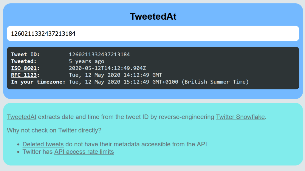 If we put in the serverID (709752884257882135), we can see that it was created on 12 May 2020 (as we knew from the Twitter date), but we get a time of 13:04:34 UTC.