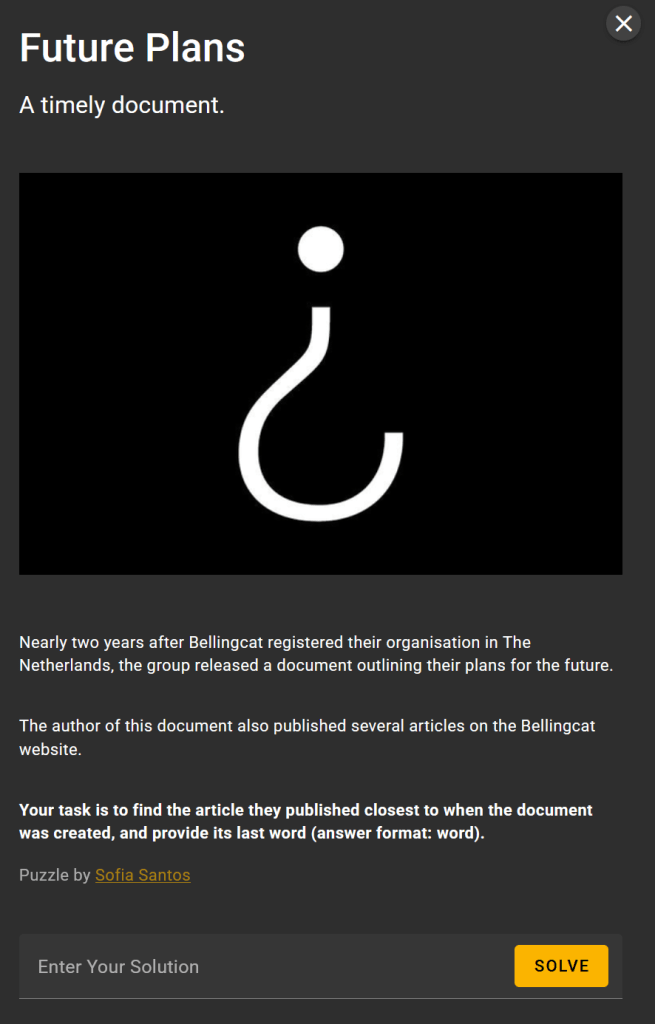 Another multipart puzzle. Find when Bellingcat was registered… find the future plans document, then find their article closest to the date.