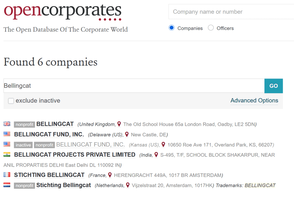 Searching for Bellingcat, I found a few entries (https://opencorporates.com/companies?utf8=%E2%9C%93&utf8=%E2%9C%93&q=Bellingcat&jurisdiction_code=&type=companies)