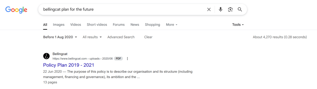 We are now looking for a document outlining the Bellingcat plan for the future, which was released nearly two years later, i.e. before August 2020.